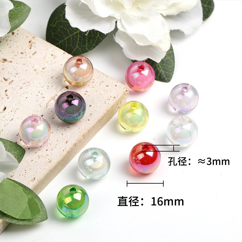 Imagine your next project sparkling with these vivid 16mm transparent acrylic beads, each featuring a shimmering UV-plated finish. These round beads radiate bold colors like fiery red, bright green, and deep purple, casting an iridescent glow that shifts with every angle.