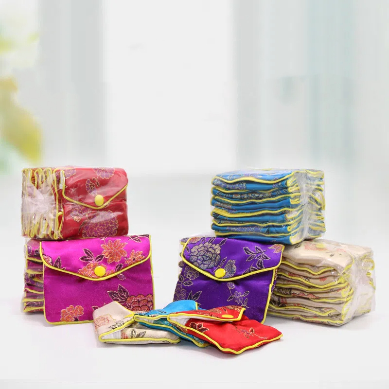 Richly embroidered with vintage Chinese plum blossom motifs, these snap closure pouches infuse traditional elegance into any project. Made from smooth brocade fabric in striking hues like deep purple, bright red, and royal blue, each pouch features sunny yellow piping for a cheerful contrast.