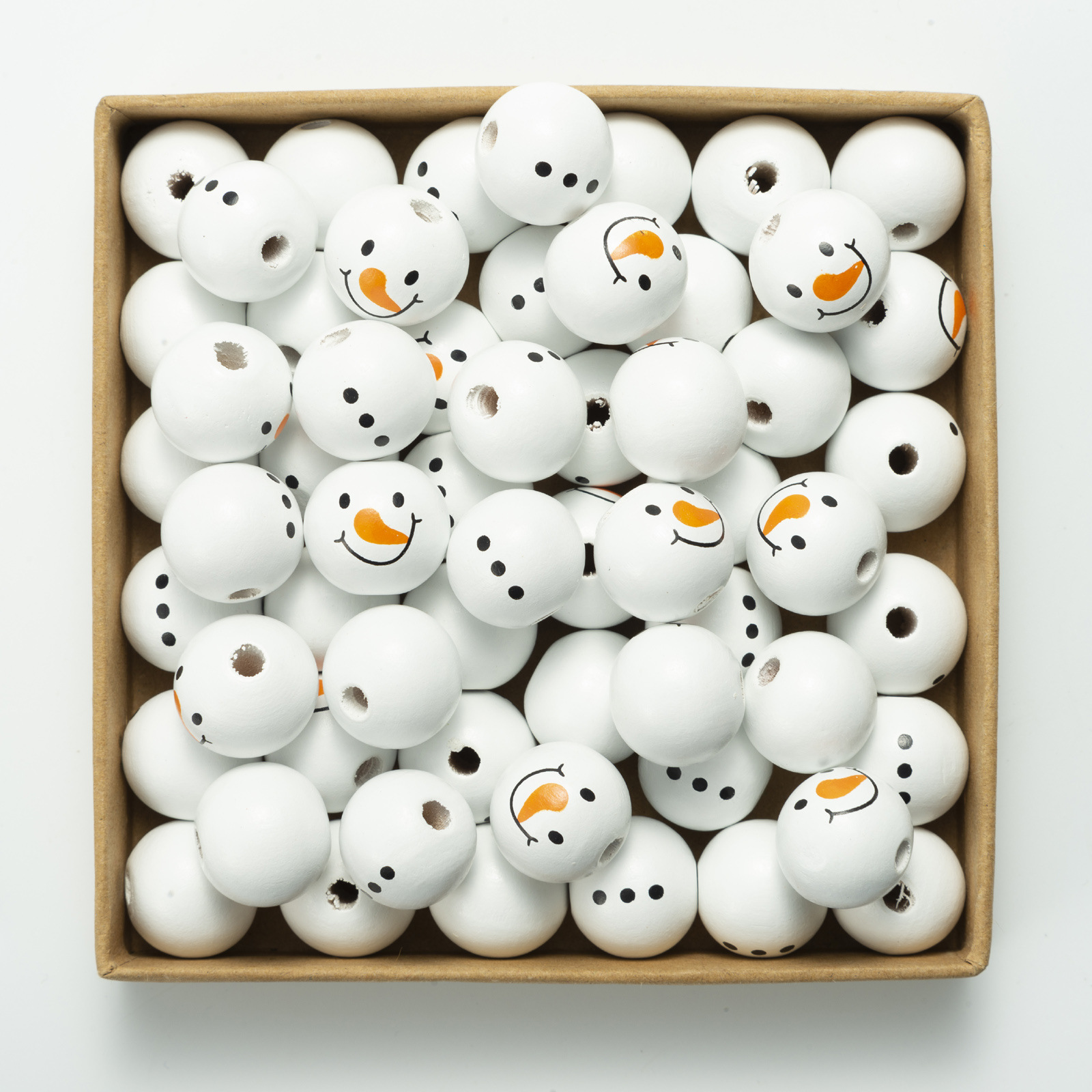 Brighten your holiday crafts with these charming 20mm Christmas Snowman Wooden Beads. Each bead showcases a cheerful snowman face, featuring a vibrant orange carrot nose and a warm smile. The rounded white body is detailed with three classic black buttons, adding playful spirit to any project.