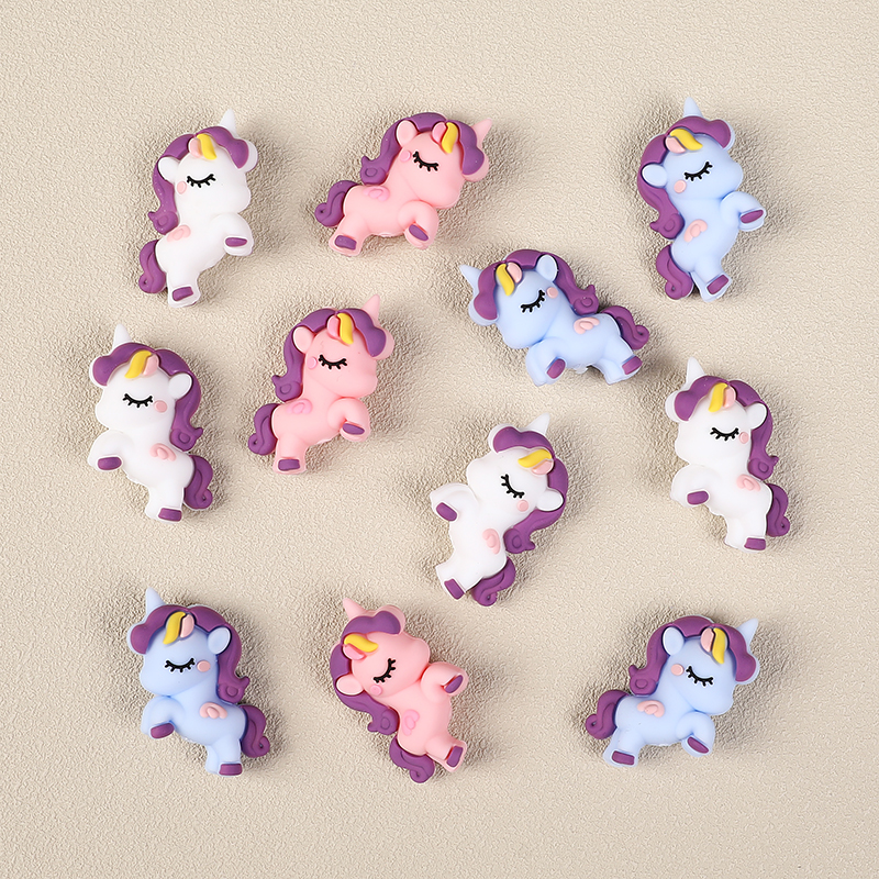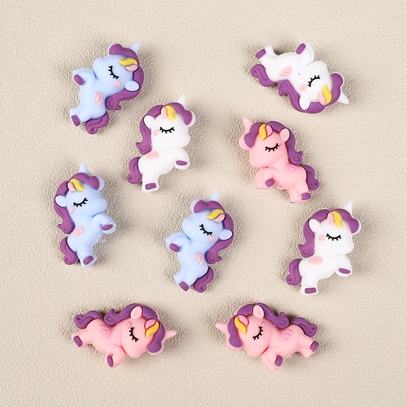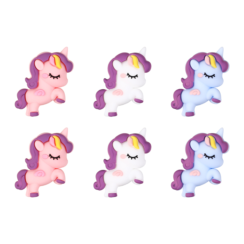 These charming 3D unicorn silicone beads add a magical touch to any craft project. Each bead showcases a sweet unicorn with closed eyes, a curly purple mane, and a pastel body in soft pink, blue, or white. Their playful pose and tiny yellow horn bring whimsical charm, perfect for children’s jewelry or themed accessories.