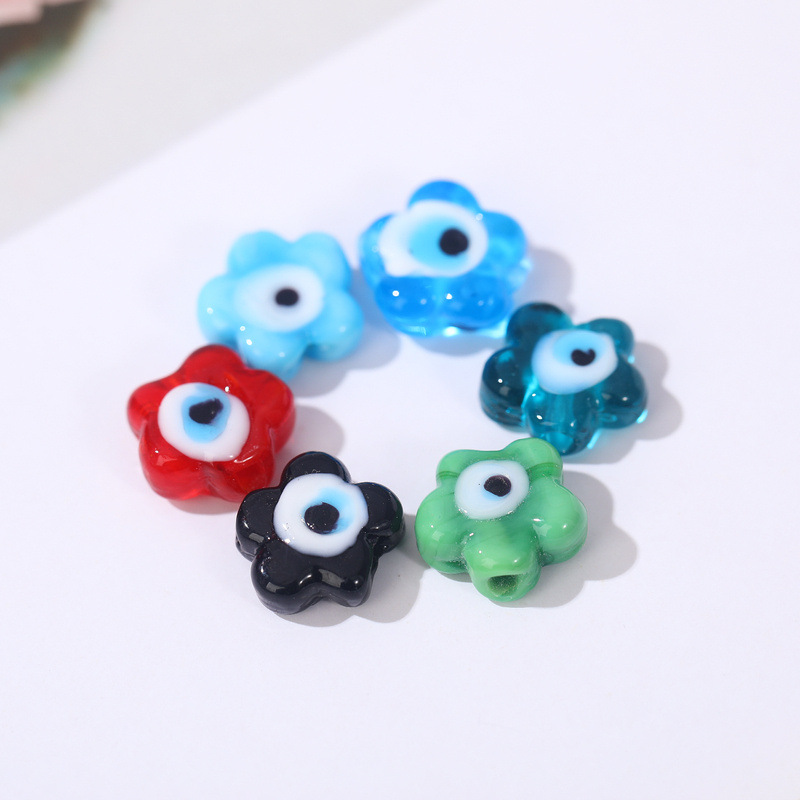 These colorful, flower-shaped evil eye lampwork beads instantly brighten any DIY jewelry with their glossy finish and playful charm. Each 12mm bead showcases a delicate flower silhouette and a striking central eye motif, blending protection symbolism with vibrant hues like red, turquoise, green, and peacock.