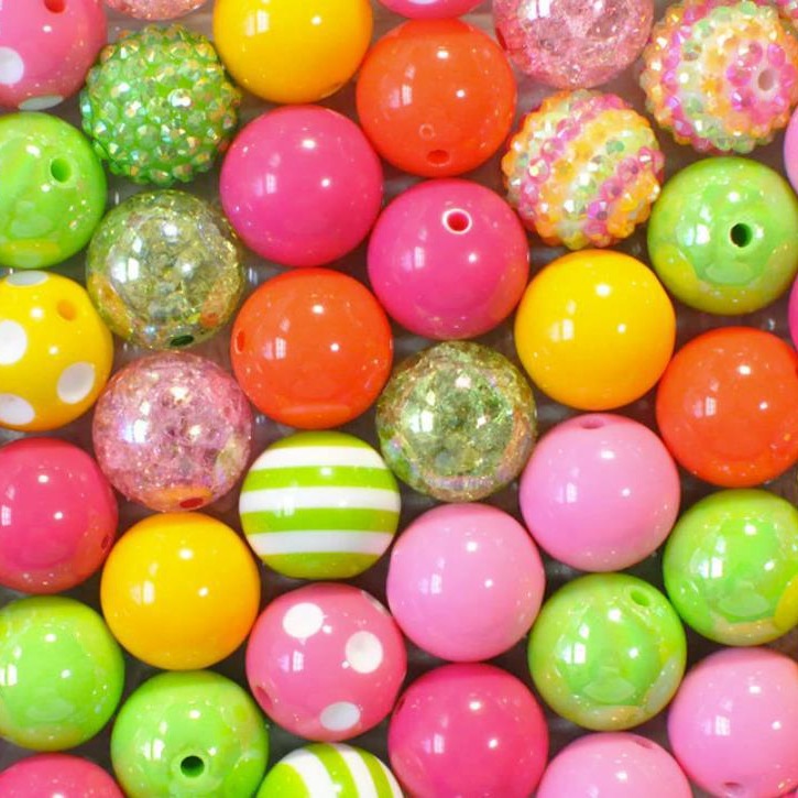 Bright and cheerful, these 50pcs 20mm bubblegum beads burst with playful colors and textures. Each bead showcases a vibrant blend of glossy solids, sparkling rhinestones, cheerful polka dots, and bold stripes.