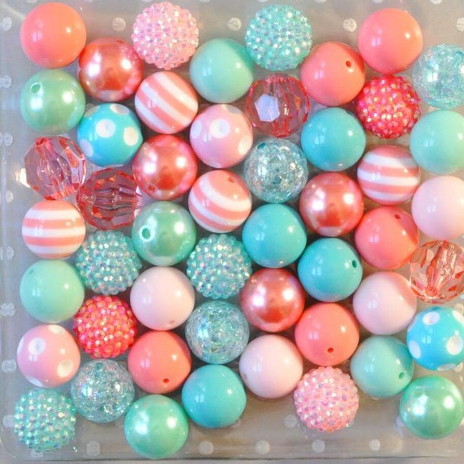 Brighten your next craft project with these playful beads in cheerful mint green, soft pink, and coral tones. Each 20mm bead features a variety of finishes—from smooth pearly surfaces and glittery rhinestones to whimsical stripes and polka dots.