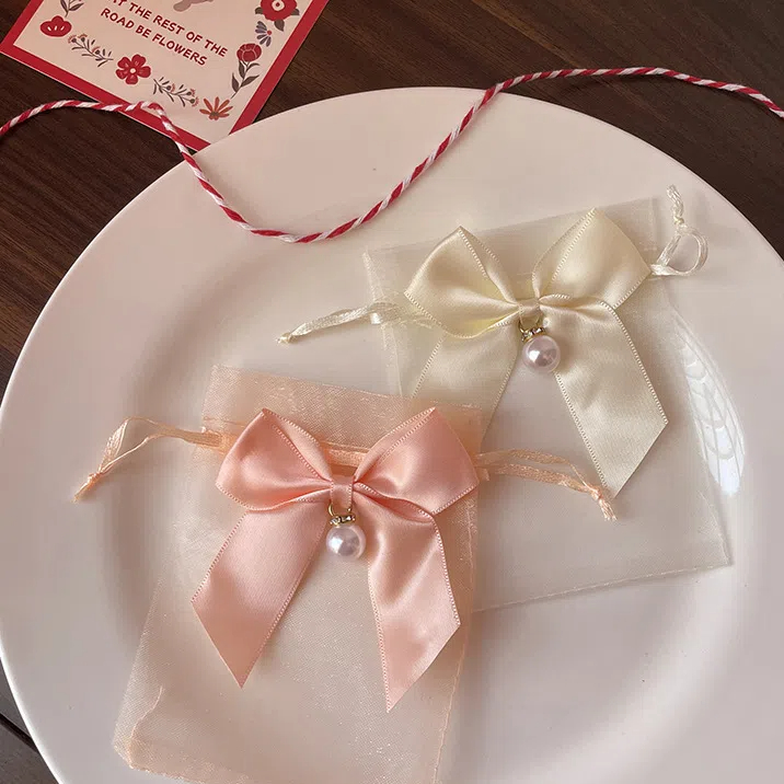 Delight in the elegant charm of these drawstring organza bags, adorned with silky pearl bows and shimmering accents. Each bag features a translucent organza body in rich hues like claret, creamy white, black, and soft pink. Sized from small to medium, they offer versatile gift wrapping and storage options.