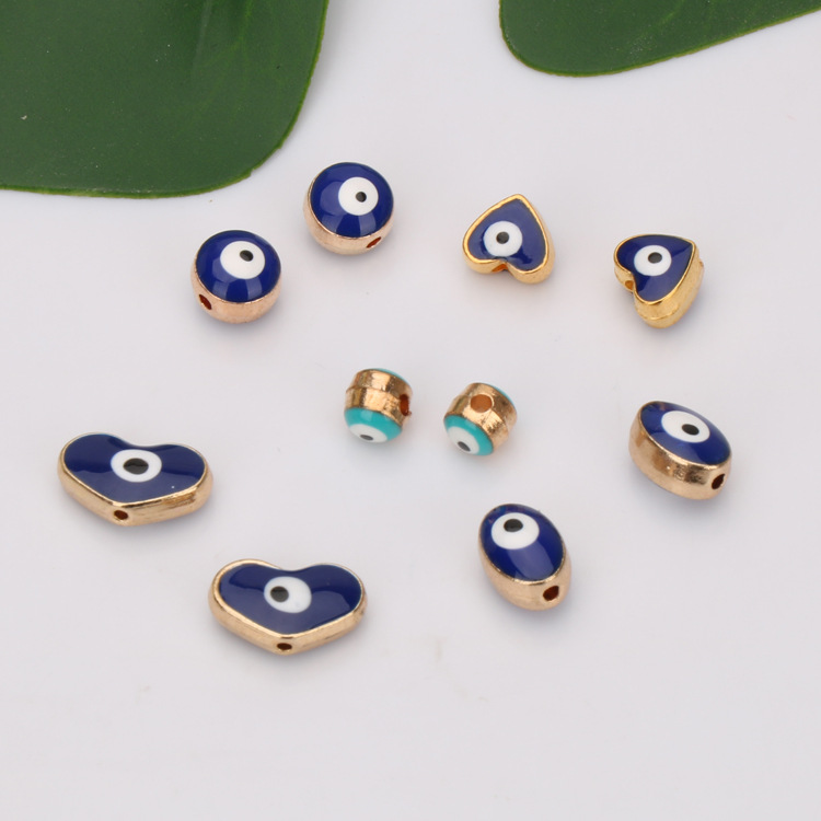 These 50pcs Turkey Evil Eye enamel alloy beads bring classic charm to your DIY projects with bold cobalt blue and gold edging. Each bead showcases a protective eye motif—some round, others heart-shaped—creating a striking, mystical, and stylish mix.