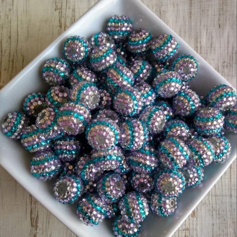 These striped bubblegum beads shimmer with a dazzling blend of purple, blue, and white rhinestones arranged in neat, sparkling bands. Their rounded shape and layered crystals create a glamorous texture that catches light beautifully.