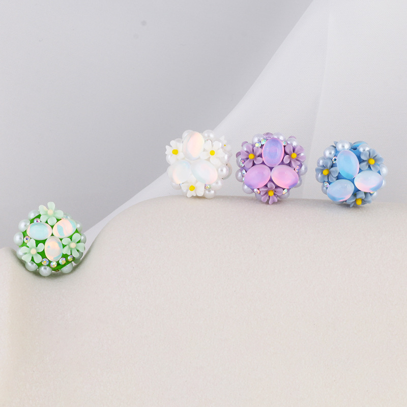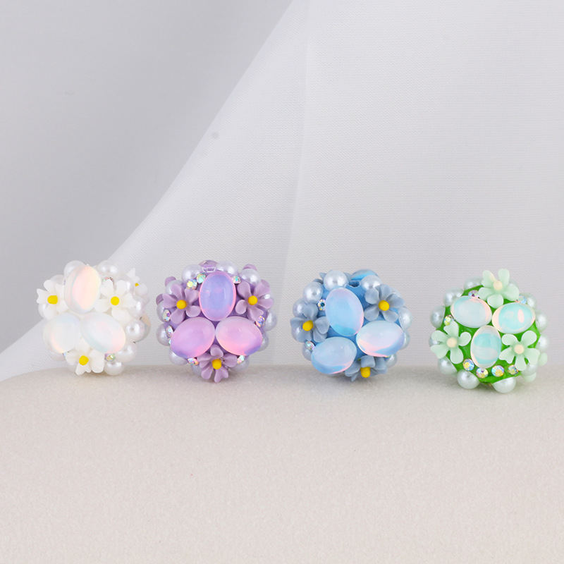 Craft whimsical charm into your creations with these 16mm Cat Eye Stone Triple Flower Bubblegum Beads. Each bead features a vibrant cluster of pearly cat eye stones, framed by delicate flowers and sparkling rhinestones. Their soft pastel hues, including sea blue and pink, radiate playful elegance.