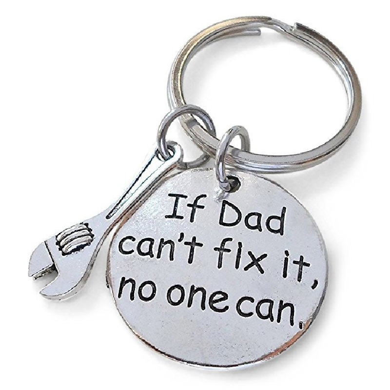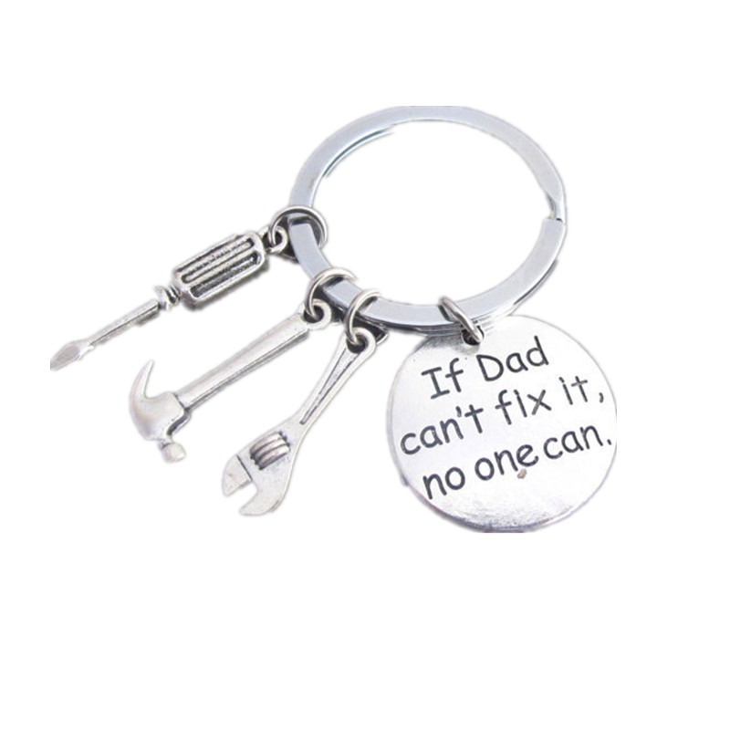 Celebrate the handyman in your life with this charming keychain that honors Dad’s fixing skills. Made from shiny alloy, it showcases a round tag engraved with “If Dad can’t fix it, no one can,” accompanied by miniature tool charms—a screwdriver, hammer, and wrench.