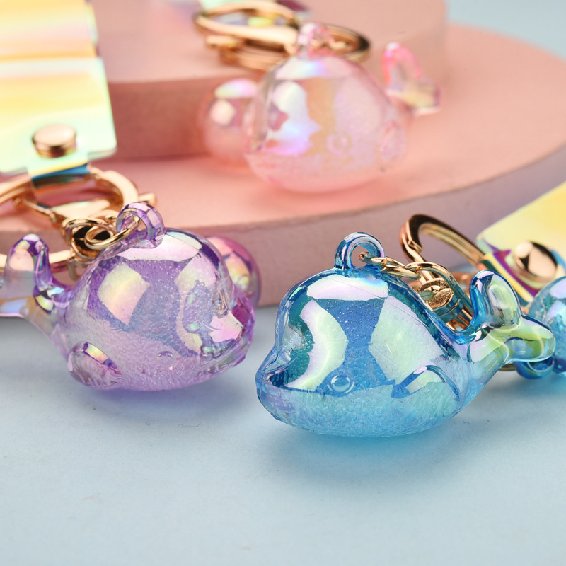 These charming acrylic dolphin keychains shine with a translucent, iridescent finish in soothing pastel hues. Each dolphin strikes a playful pose, paired with a matching orb charm to add a whimsical touch—perfect for personalizing bags or keys.