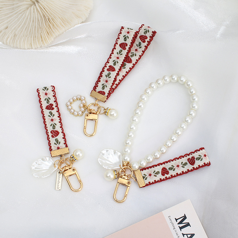 Add a charming touch to your daily essentials with these Fabric Strawberry Lace Ribbon Pearl Keychains. Each keychain features a delicate woven ribbon decorated with vibrant strawberry and floral motifs in warm reds or bright yellows, edged with petite scalloped trims.