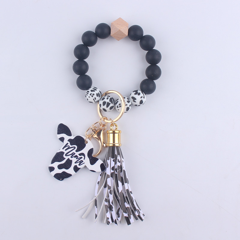 This playful keychain features a cute cow-head silhouette paired with black-and-white silicone beads. Soft matte black beads blend seamlessly with spotted silicone accents and a natural wood chip bead, creating a tactile, eye-catching bracelet that doubles as a key ring.