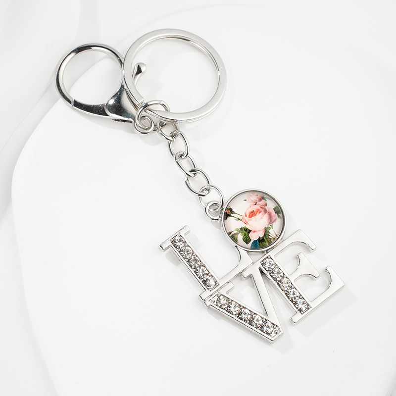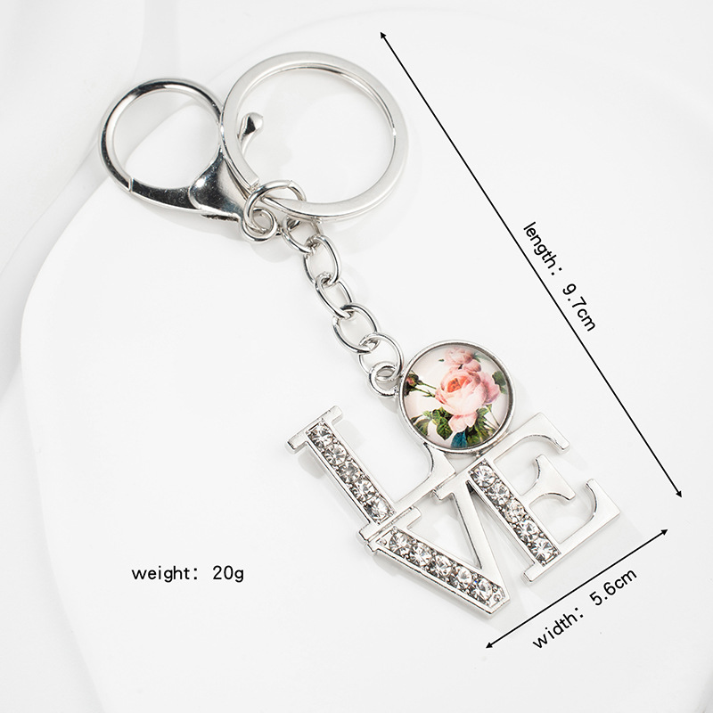 This elegant metal keychain features the word “LOVE” adorned with clear diamond-like accents. A delicate round charm with a soft pink rose adds a subtle, romantic floral touch.