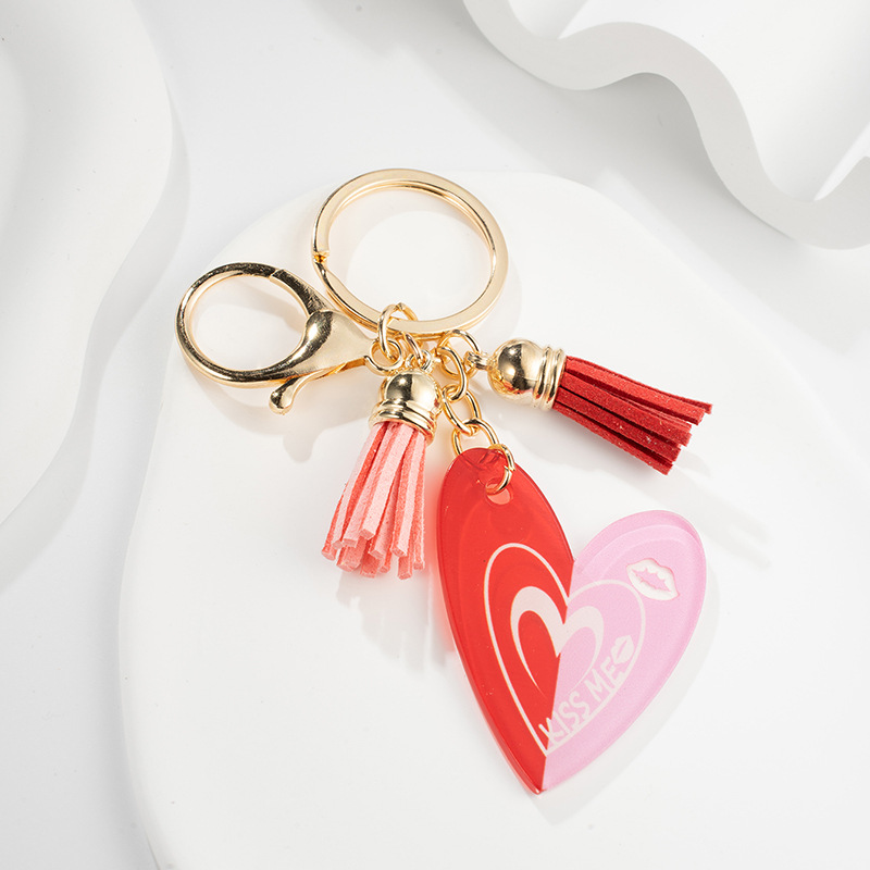 Gold-toned hardware and two tassels in matching shades complete its lively look. Perfect for gift shops and seasonal promotions, this keychain appeals to those seeking a trendy yet sweet Valentine’s accessory. Use it as a creative add-on for DIY gift wrapping or to brighten everyday essentials.