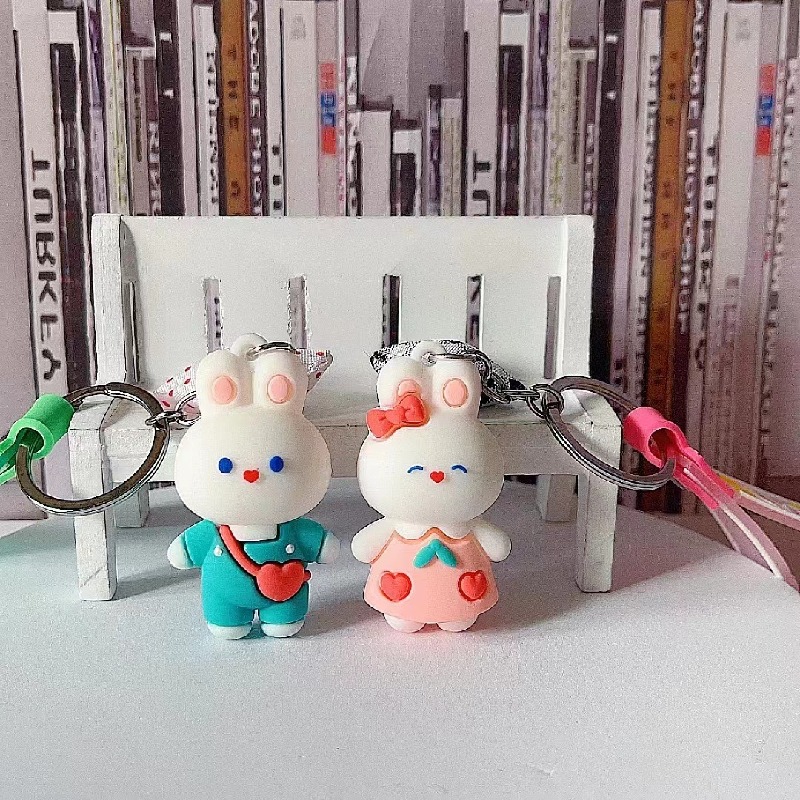 Spark playful charm with these silicone cartoon white rabbit keychains, each featuring a bright pastel strap and a chubby bunny charm dressed in cheerful outfits. The white rabbits show sweet, simple expressions—one with blue eyes and a red bag, the other with closed smiling eyes and a pink dress with a bow—radiating fun and whimsy.